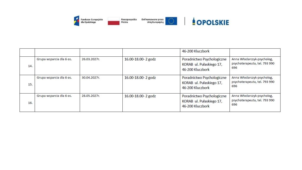 Projekt wpiera również opiekunów faktycznych 6 osób (4K/2M) poprzez podniesienie ich kwalifikacji w zakresie opieki nad osobami starszymi oraz udzielenie kompleksowego wsparcia psychologicznego.