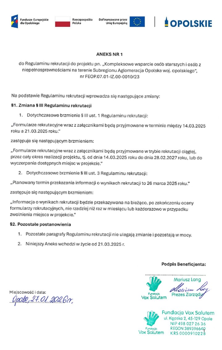 Rekrutacja osób starszych i niepełnosprawnych do projektu: Kompleksowe wsparcie osób starszych i osób z niepełnosprawnościami na terenie Subregionu Aglomeracja Opolska woj. opolskiego realizowane przez Fundację VOX SALUTEM numer FEOP.07.01-IZ.00-0010/23